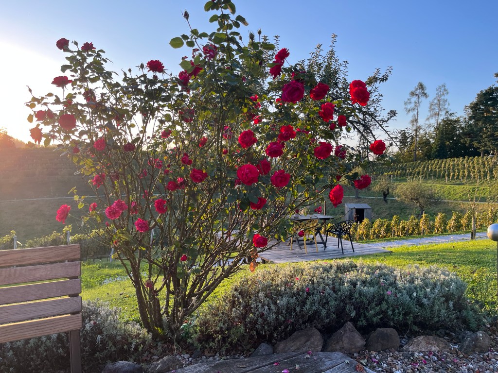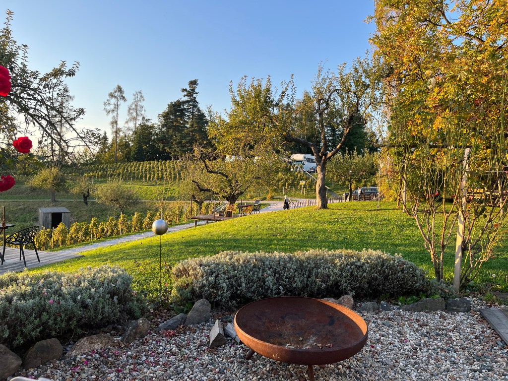 Wir haben uns im Weingut angemeldet und für 18 Uhr einen Tisch bestellt. Dann haben wir die Turnschuhe gegen die Wanderschuhe getauscht und sind mit der Wanderapp Komoot los, um die Umgebung zu erkunden. Ich muss nicht wirklich erwähnen, dass wir trotz bzw. wegen der App ein paar Umwege gegangen sind, hier und da waren wir (also die App und wir) uns nicht ganz einig, weil der vorgegebene Weg über Privatstraßen gehen sollte und durch Vorgärten von bewohnten Häusern. Hier haben wir lieber nicht der App vertraut, wir wollten ja keinen Ärger mit Anwohnern, wenn wir da mit einem Hund an der Leine durch den Garten wandern…