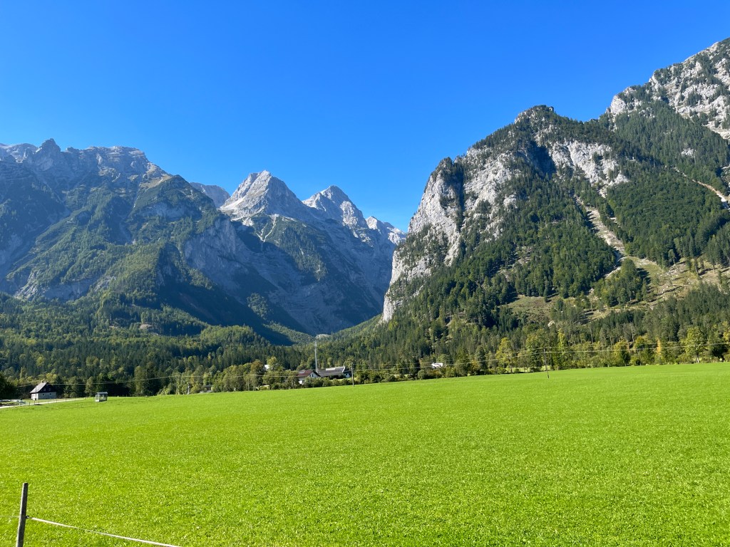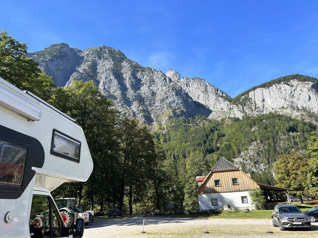 Wir stellten uns früh den Wecker, um natürlich festzustellen, dass der freundliche Herr inkl. des Busses noch direkt vor uns standen und wir somit nirgendwohin fahren können. Nun ja, also machten wir noch ein paar Minuten die Augen zu, bis wir hörten, dass die sich abfahrbereit machen. Dann schnappte ich mir Nala für eine kurze Hunderunde und Mike kochte uns einen Kaffee für die Fahrt. Unser heutiges Ziel waren: BERGE… nun ja, das sollte in Österreich nicht allzu schwer werden. Mike hatte ein passendes Ziel in Hinterstoder in den Kalkalpen gefunden. Auf dem Weg dorthin kauften wir noch Semmeln mit Leberkäse (bei Spar, weil es dort viel günstiger ist, als an Tank- oder Rastplätzen – lieben Dank für den Tipp an den künftigen Ehemann im Hause Weingut Grill). In Hinterstoder gibt es einen Gasthof, wo man nicht nur gut essen kann, man darf dort auch eine Nacht mit dem Womo stehen und kann von dort aus ein paar Wanderrouten gehen.