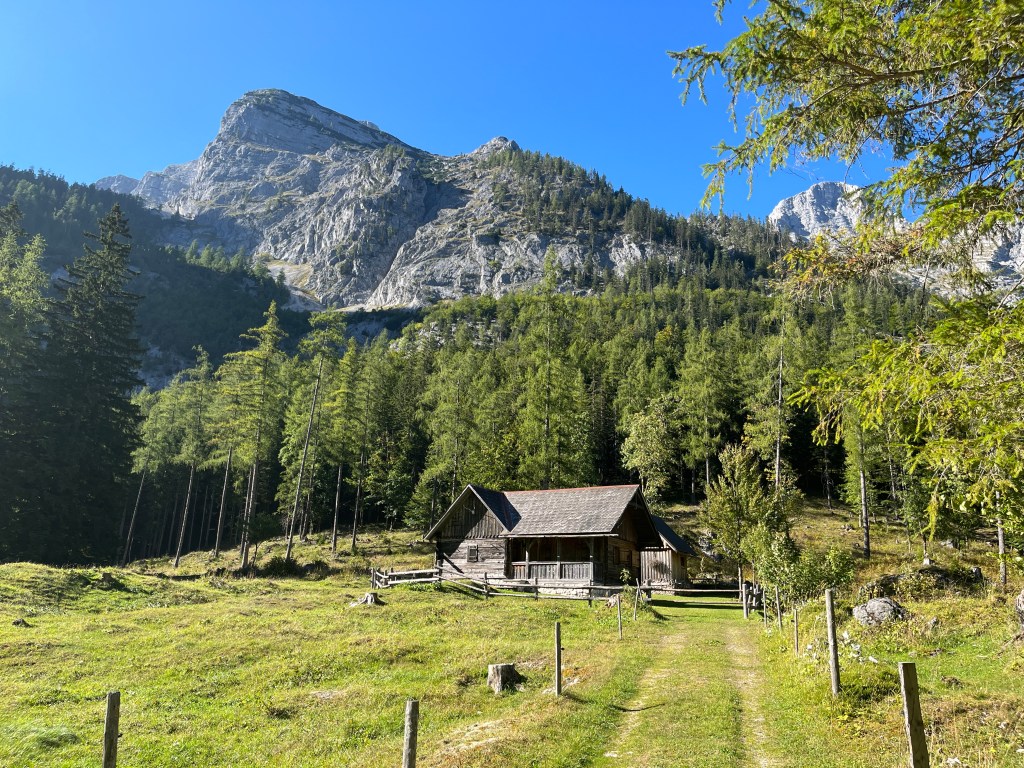 Angekommen am Almgasthaus Baumschlagerreith haben wir Hupi geparkt, dann gefragt, wie lange das Gasthaus geöffnet hat (bis 18 Uhr) und uns dann entschieden, eine Runde wandern zu gehen. Mike hat eine Route über Komoot rausgesucht und was soll ich sagen – raus aus den Turnschuhen, rein in die Wanderschuhe, Wasser für uns und Nala in den Rucksack gepackt und dann ging es los.