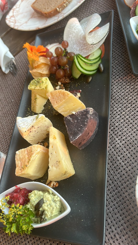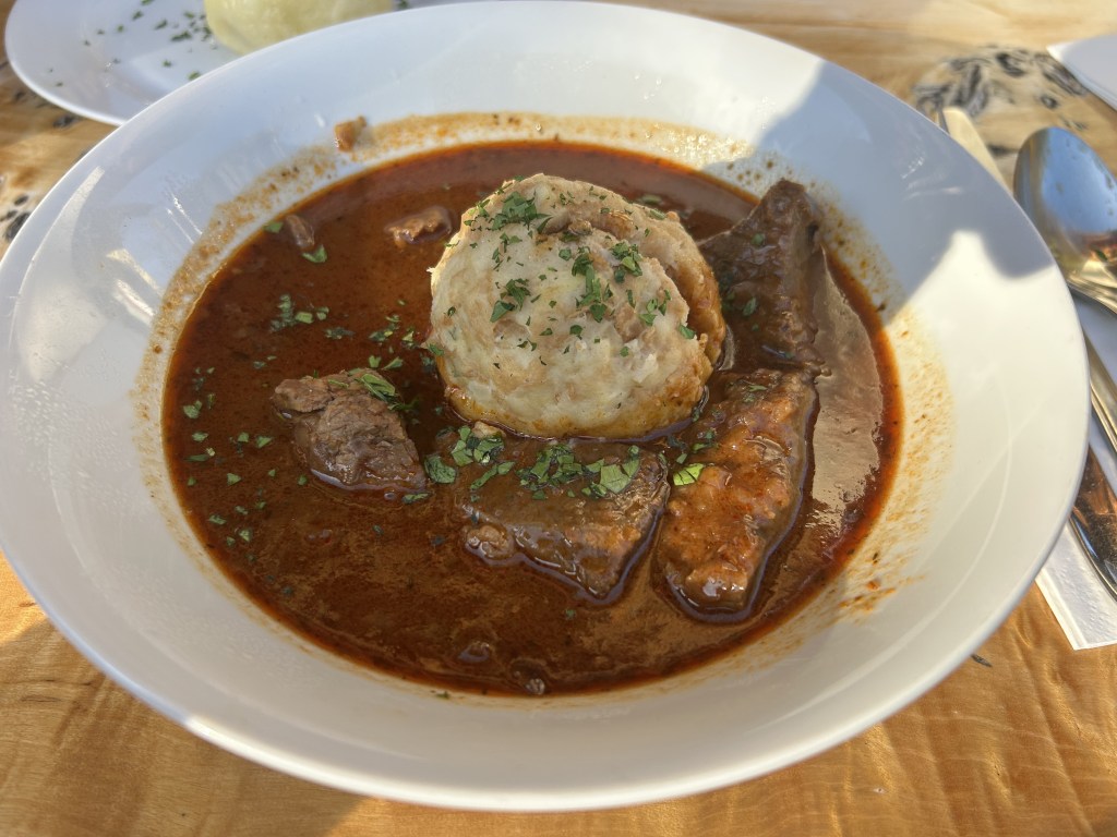 Wir kamen so rechtzeitig am Womo an, dass wir noch duschen konnten und uns dann draußen im Sonnenschein am Almgasthaus einen Platz auszusuchen. Neben dem Parkplatz des Gasthauses sind Wiesen und auch ein Gehege für eine Gruppe Rehe mit einem stattlichen Hirsch. Ich war echt überrascht, wie extrem laut der vor sich hinröhren kann. Was für eine Geräuschkulisse. Wir bestellten Rindergulasch mit Knödeln – alles hausgemacht und sowas von lecker