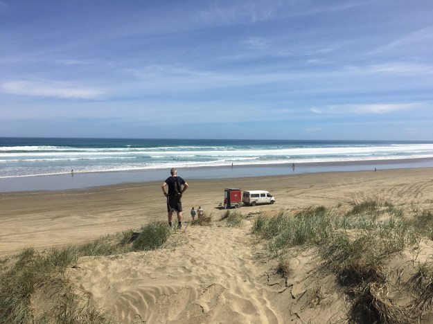Den wollten wir uns mal anschauen. Also fuhren wir auf der asphaltierten Straße und haben dort den Camper geparkt, bis diese zu einem Sandweg wurde. Von da an sind wir zu Fuß weiter. Und dann nach ein paar Dünen sahen wir das