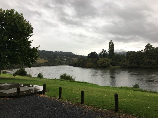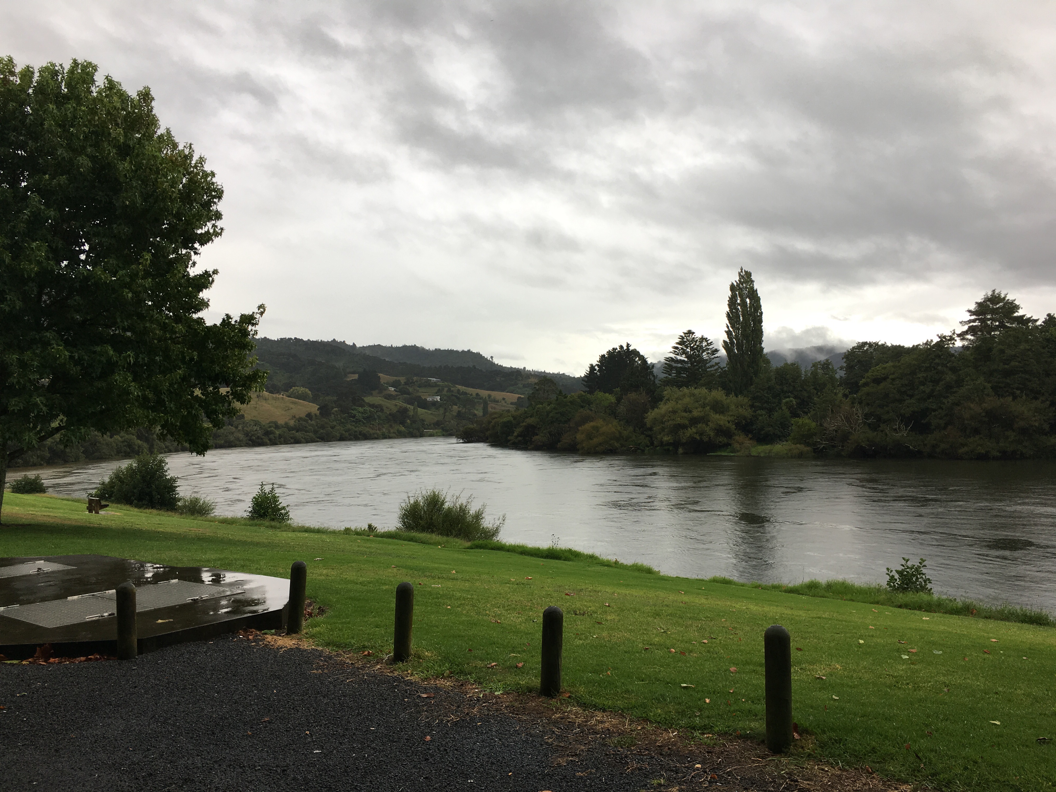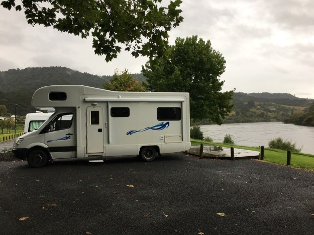 Das haben wir dann auch gemerkt, wir kamen gerade bis zu dem Campground und danach war die Straße gesperrt. Da wir die Nacht zuvor schon extrem von dem Sturm durchgeschüttelt wurden, war ich bei dem Gedanken an die nächste Sturmnacht direkt am Meer nicht sooooo begeistert und wir entschieden uns, dem Sturm zu entfliehen und einen Campground im Landesinneren anzusteuern. Den haben wir dann auch in der Nähe der Stadt Ngaruawahia (viel Spaß beim Aussprechen 😉) direkt an einem Fluss gefunden. Dies ist auch ein kostenloser Platz für Selbstversorger. Hier war es ruhig (die in der Nähe vorbei fahrenden Züge haben uns nicht gestört) und es hat heute morgen sogar die Sonne geschienen. 😊