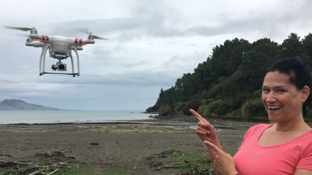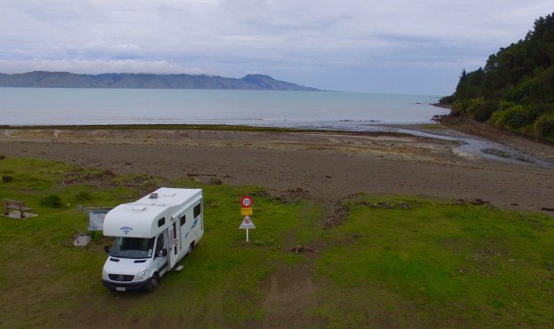 in Te Wairoa. Als wir dort ankamen stand lediglich ein anderer Camper dort und ich war noch so sicher, ob ich da über Nacht bleiben möchte …. da sind wir dann wieder bei meinen wirren Phantasien… (man könnte uns überfallen und ausrauben oder so ähnlich) ganz unabhängig, dass ich einen großen und starken Mann an meiner Seite habe, der aufpasst… nun ja, wir haben uns entschieden, dort zu bleiben und haben es nicht bereut. Wir stehen mit Blick zum Strand und zum Meer und da es so „einsam“ war, konnte der Mann Skye, unsere Drohne starten lassen. Seht selbst