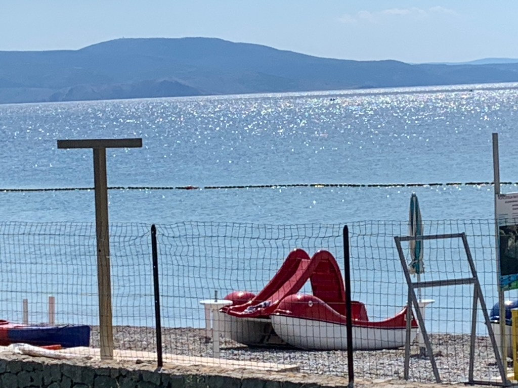 Hier haben wir Ruhe, ein tolles Meer vor der Tür (in Wurfweite… na gut, nicht bei meinem Wurfkünsten) also eine Minute von unserem Womo entfernt und in Sichtweite, mehrere gute Restaurants in der Nähe und mit Beach-Bar (ohne Beach… aber dafür mit Beton) und einen Tretboot-Verleih.