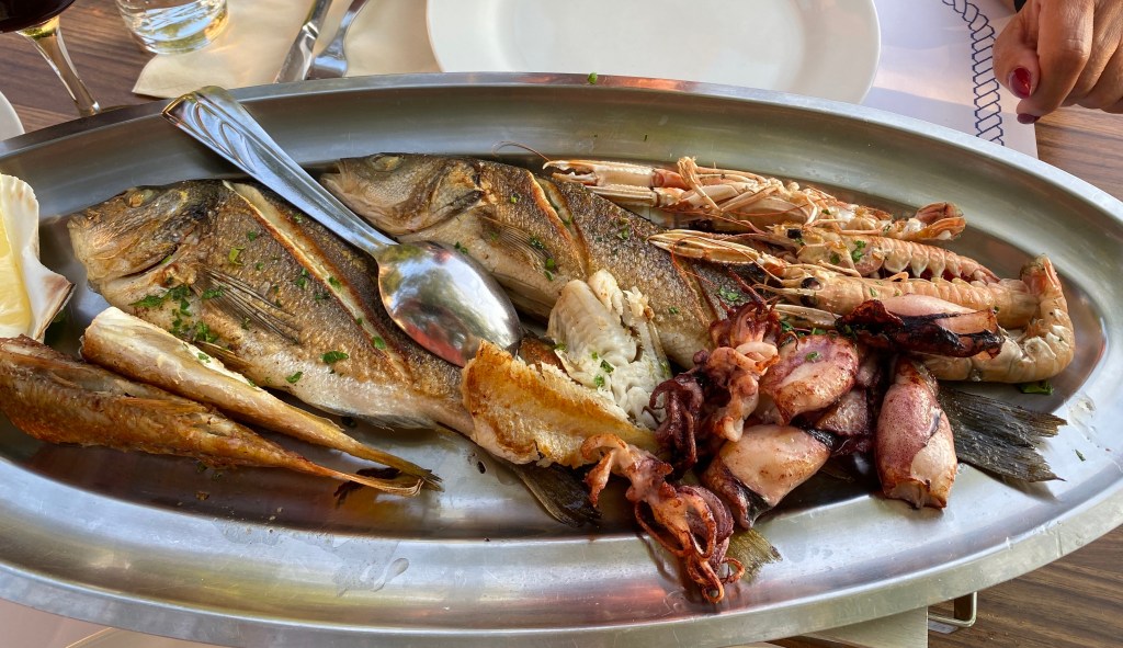 Dann kam der Fisch. Die Platte sah toll aus, lediglich die Mini-Langusten und der Tintenfisch waren ohne jegliche Gräten… der Rest musste also von uns seziert werden 😂😂😂