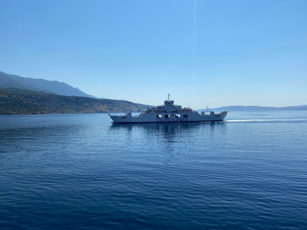 Wir haben uns doch sehr spontan entschieden, von Novi Vinodolski schon einen Tag früher nach Pag aufzubrechen. Eigentlich hatten wir dort erst ab dem 14.09.2021 einen Platz im Terra Park Phalaris für drei Tage gebucht. Also aufgestanden, alles verstaut, Mike hat für mich einen Becher schwarzes Gold gekocht… (jeder, der mich kennt, weiß, dass mein Motor erst nach mindestens einem Kaffee läuft…), den Platz bezahlt und ab in Richtung Fähre nach Pag. Am Hafen angekommen hatten wir Glück, auf der dort wartenden Fähre war noch ein Plätzchen für uns. Also schnell bezahlt und rauf auf die Fähre. Die Überfahrt dauert nicht so lange, ich konnte aber ein Foto von der anderen Fähre machen, die gerade an uns vorbei fuhr.