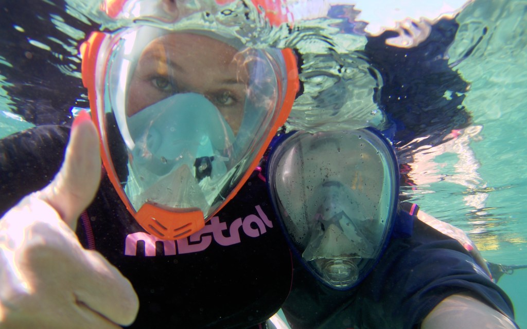 Nach dem Frühstück haben wir kurz abgewaschen und waren eine Runde spazieren. Irgendwann stach uns der Hafer und wir beschlossen, Schnorcheln zu gehen und endlich unsere neuen Schnorchel-Masken auszuprobieren. Lustig anzusehen ist bestimmt jedes Mal, wenn wir versuchen, elegant in die Taucherflossen zu kommen, ohne umzufallen. So langsam haben wir Übung darin, also Flossen an, ab ins Wasser (rückwärts bietet sich hier an) und dann haben wir unsere neuen Masken aufgesetzt. Ich bin super zufrieden, konnte gut atmen und es kam auch kein Wasser rein. Mike hatte einen leichten Wassereintritt, das kann aber an seinem Bart gelegen haben… unter Wasser sahen wir beide super toll aus