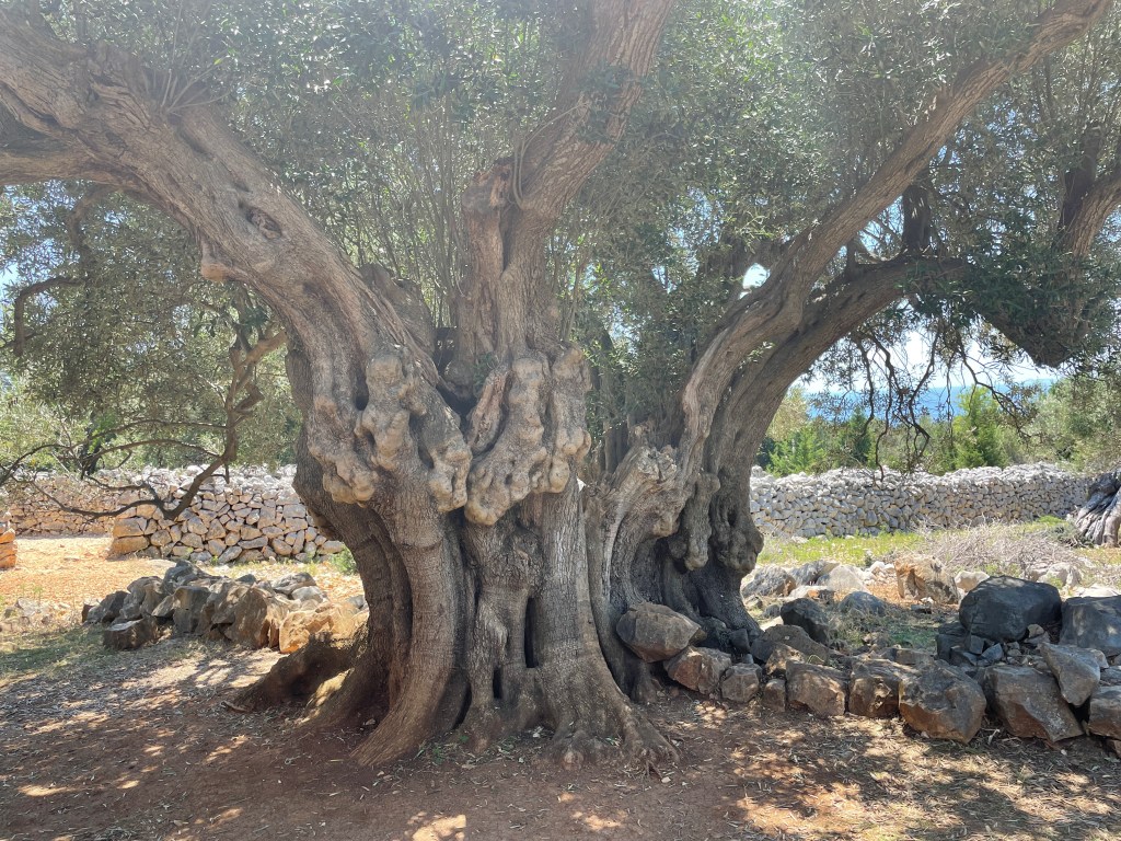 Nach ca. 17 km kamen wir an der Olivenplantage an, haben brav den Eintritt bezahlt und sind dann zu Fuß (und irgendwann auch auf dem Bike) durch diese Plantage. Was soll ich sagen, links und rechts Olivenbäume – leider ohne leckere Oliven, aber dafür haben wir einen 2000 Jahre alten Olivenbaum anschauen dürfen. Was der wohl alles schon erlebt hat in / auf dieser doch etwas verrückten Welt…