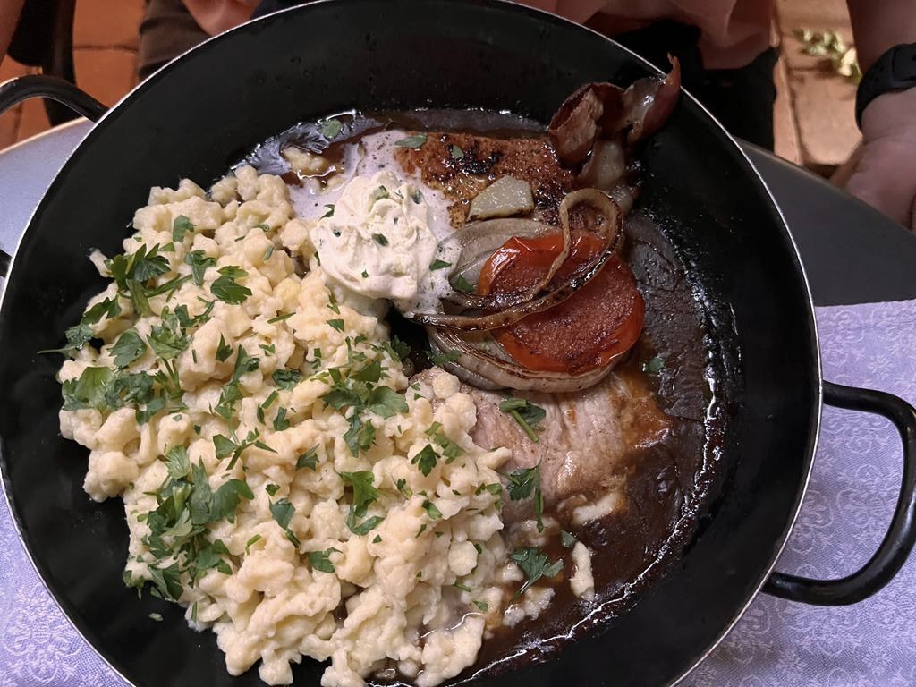Es scheint so, als ob die Sauce bei beiden Gerichten gleich war. Ich war von meiner Pfanne mit den Spätzle leider nicht so begeistert, Mike hat es wohl soweit gut geschmeckt. Relativ schnell nach dem Essen haben wir bezahlt und sind durch die Straßen gewandert. Golling hat (wie so viele andere Städtchen in Österreich) eine eigene Burg, die war noch nicht geschlossen, also haben wir uns noch den Burghof angeschaut, da war aber nix los.
