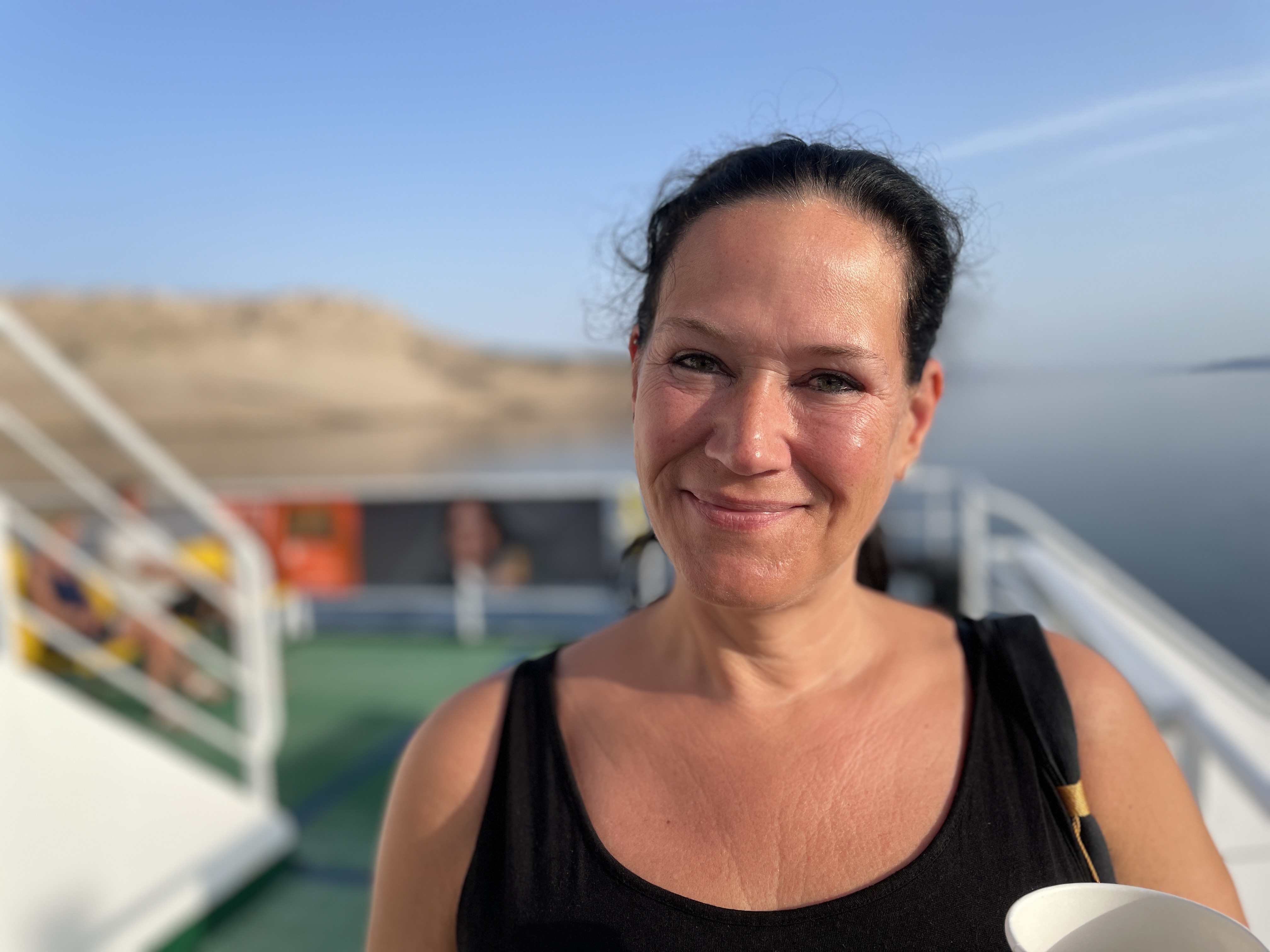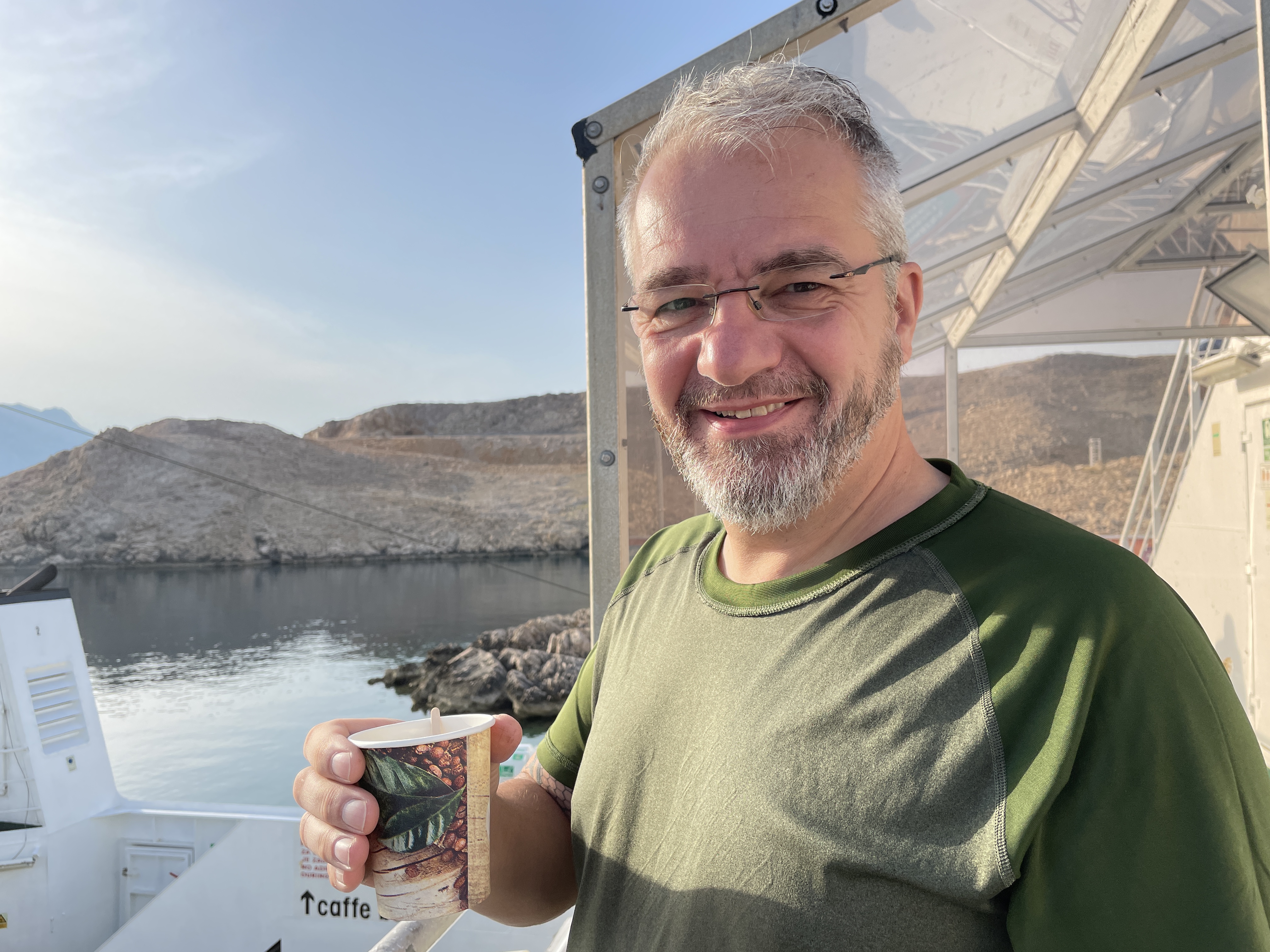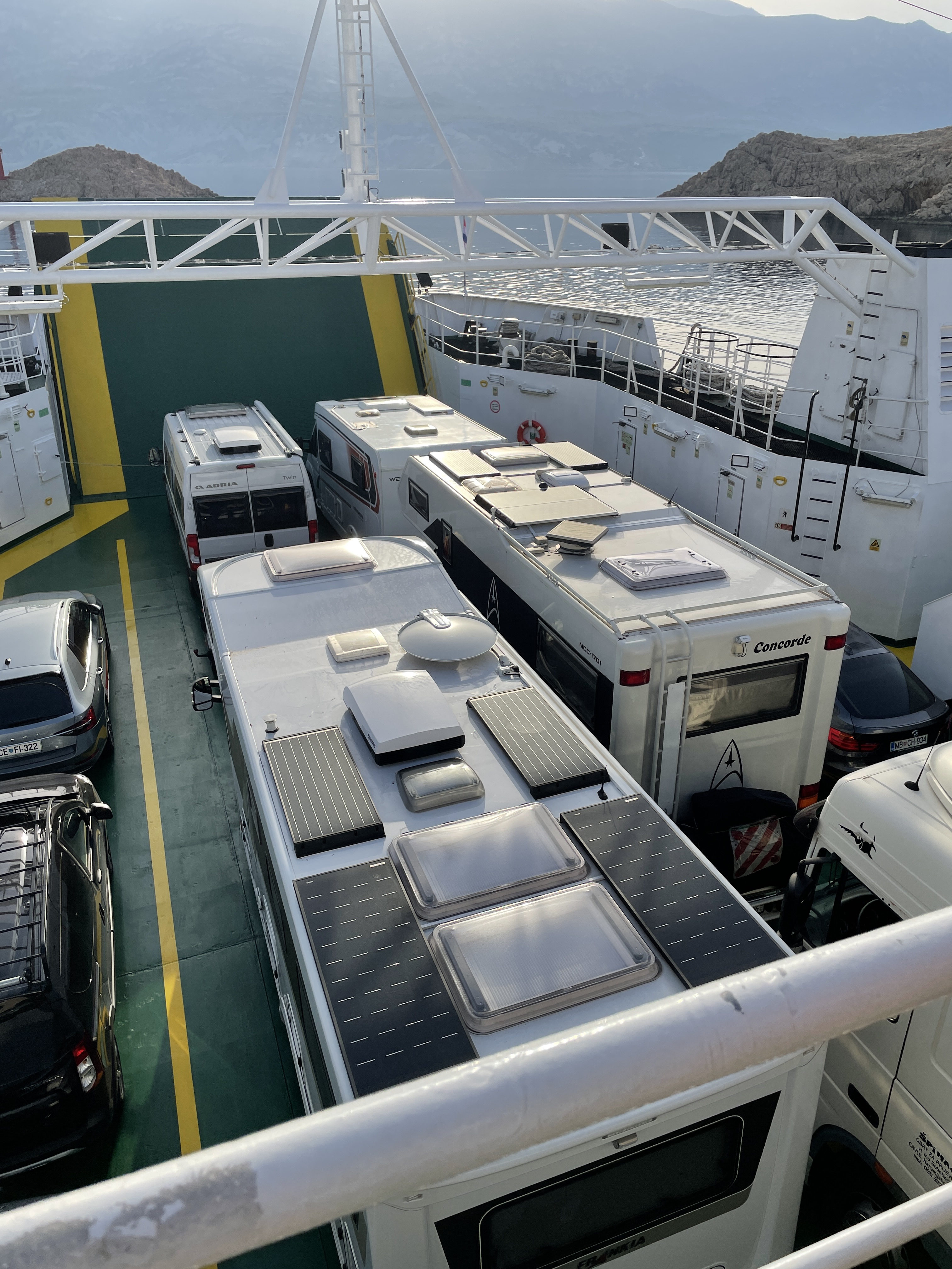 Dann kamen wir am „Hafen“ an, wollten unsere Überfahrt bezahlen und die nette Dame an der Kasse fragte mich, ob unser Womo unter oder über 7 Meter lang sei. Ich antwortete: 7 Meter und sie bat mich, dass Mike das Womo bitte einmal vor- bzw. an dem Kassenhäuschen vorbei fahren möge. Das tat Mike dann auch und die Dame entschied mit einem Zwinkern: Ach, das sind keine 7 Meter… (kleine Anmerkung der Redaktion: Hupi ist schon ohne die derzeit für den Transport der Fahrräder ausgezogene Stoßstange 7,20 lang). Dank der freundlichen Dame haben wir also bei der Überfahrt noch Geld gespart 😉 Wir stellten uns brav in die Warteschlange für Womos und kurz danach kam dann auch die Fähre, die gegen 7.15 Uhr zum Festland startete.