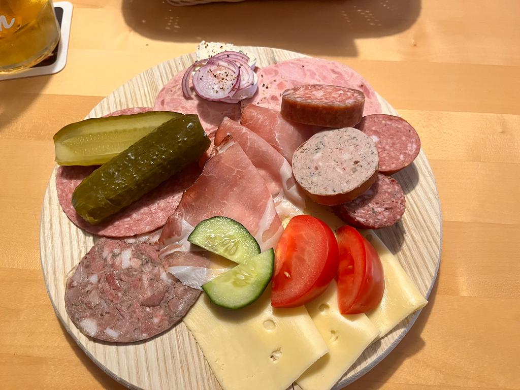 Von Bayern aus ging es weiter auf der A 9, ich suchte derweil nach passenden Plätzen für eine Übernachtung und fand auch einen nahe Hipoltstein direkt am Main-Donau-Kanal. Schiffe gucken ist ja eh unsere Passion, also nichts wie hin da. Dort angekommen schauten wir, wo wir uns denn hinstellen wollten, dort standen erst vier Wohnmobile. Dann kamen wir an ein Schild auf dem stand, dass der Stellplatz in der Zeit ab dem 20. Juni 2022 wegen Aufbau der Start/Landezone des Triathlons gesperrt sei. Nun ja, ob die anderen Womo-Besitzer nicht lesen konnten oder es gekonnt ignoriert haben, lassen wir mal dahin gestellt sein. Wir sind lieber weiter gefahren. Also zurück zur Autobahn und weiter nach Pottenstein. Dort gibt es einen Bauernhof, der Bauer hat auf seinem Gelände 8 Stellplätze für Wohnmobile hergerichtet. Große Plätze mit Kiesuntergrund, Stromanschlüssen und sogar mit Ver-/und Entsorgungsstation. Besonders interessant fanden wir, dass er auch ein Brotzeitstüble hat, wo er frische Aufschnitt- und Käseplatten und diverse Getränke zum Verzehr anbietet. Also haben wir uns dort hingestellt und brav angemeldet. Wir wurden sehr gastfreundlich empfangen und fragten nach, ob es noch Essen gäbe. Der Betreiber sagte „klar, was wollt’s denn haben ?“ und wir bestellten zwei gemischte Platten und einheimisches (fränkisches) Bier.