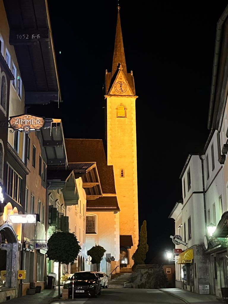 Als wir noch in dem Restaurant saßen, kam eine ganze Horde Schüler durch das Restaurant (wir haben dann gesehen, dass die auch Zimmer vermieten und vermuten, dass es eine Schulklasse auf Klassenreise war) gelaufen. Genau diese Horde haben wir dann eher unglücklicherweise wieder getroffen. Mike hat eine Bar entdeckt, die eine Disco-Kugel in einem Turm hängen hatte. Das sah interessant aus und schon waren wir drinnen. Da wir gern draußen auf der Terrasse sitzen wollten, hat Mike sich umgesehen und wir haben noch einen kleinen freien Tisch ergattert. Die anderen Tische waren von der Schulklasse besetzt. Das waren ca. 30 junge Menschen, die alle ihr Handy in der Hand hatten, ständig „Alter oder Digger“ gesagt haben und sich – obwohl sie sich gegenüber saßen, angeschrien haben. Ich wusste gar nicht, dass diese Wörter auch im Sprachgebrauch von Österreichern sind 😉
