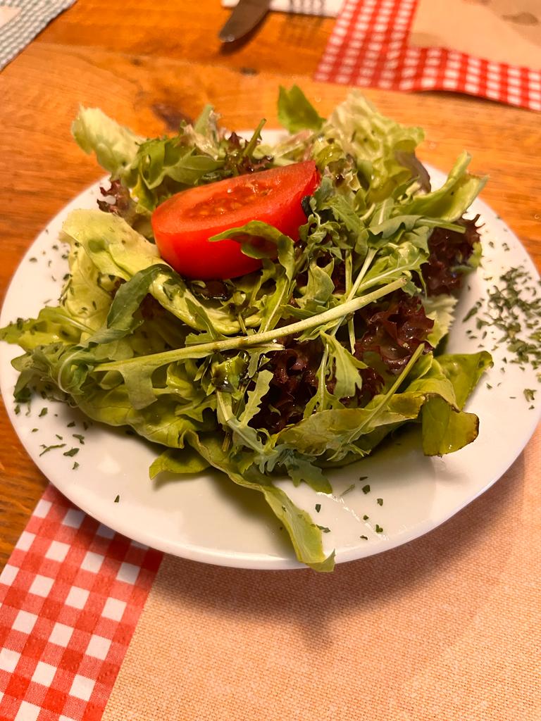 Was soll ich sagen, die Besitzerin war nicht unbedingt freundlich, als wir drinnen gefragt haben, ob die noch einen Tisch für 2 Personen frei hätten. Sie sagte wortwörtlich: drinnen is voll, müsst es draußen versuchen. Ok, also raus auf die rückwärtig gelegene Terrasse. Dort waren zwar Tische frei, wir mussten jedoch warten, bis uns ein Platz zugewiesen wurde. Bekommen haben wir dann einen Tisch, an dem wirklich nur zwei Personen sitzen können und das auch nur, wenn man pro Person nur einen Teller Essen bekommt, mehr Platz war auf dem Tisch nicht 😉 Also haben wir brav bei der (verständlicherweise gestressten Bedienung – sie hatte den gesamten Außenbereich allein zu versorgen) unser Essen bestellt.