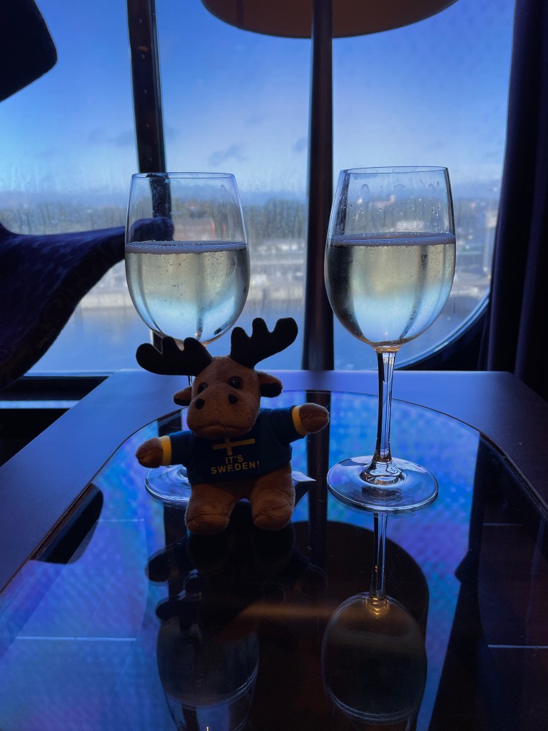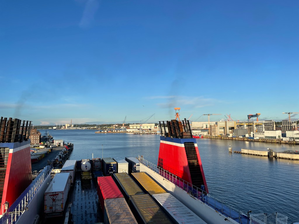 Als wir in Kiel ankamen und gewartet haben, auf die Fähre zu fahren, war es bewölkt und hat geregnet. Dann, als ob der Wettergott uns einen Gefallen tun wollte, klarte es auf und nach dem Genuss des Proseccos gingen wir an Deck, um die Ausfahrt aus dem Hafen zu beobachten. Die Sonne schien, als wir ablegten.