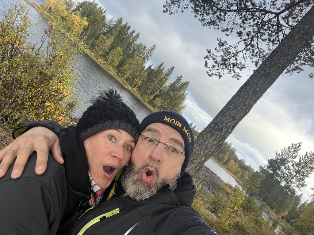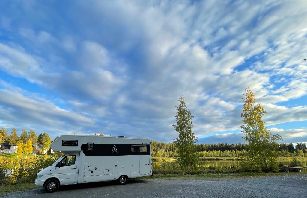 Es hatte die Nacht über geregnet. Wie gewohnt, haben wir im Bett einen Kaffee genossen und haben dann zusammen das Frühstück gemacht – ok, ich war kurz (und wirklich nur kurz) im Bad und Mike hat dann bereits angefangen, das Frühstück zu machen. Ich hab dann noch ein wenig geholfen ;-)) Nach dem Frühstück klarte der Himmel langsam auf und wir fuhren bei Sonnenschein in Richtung Strömsund. Dort wollten wir tanken, Frischwasser auffüllen und noch ein paar Lebensmittel kaufen, bevor es für uns auf die Wildernisroute geht.