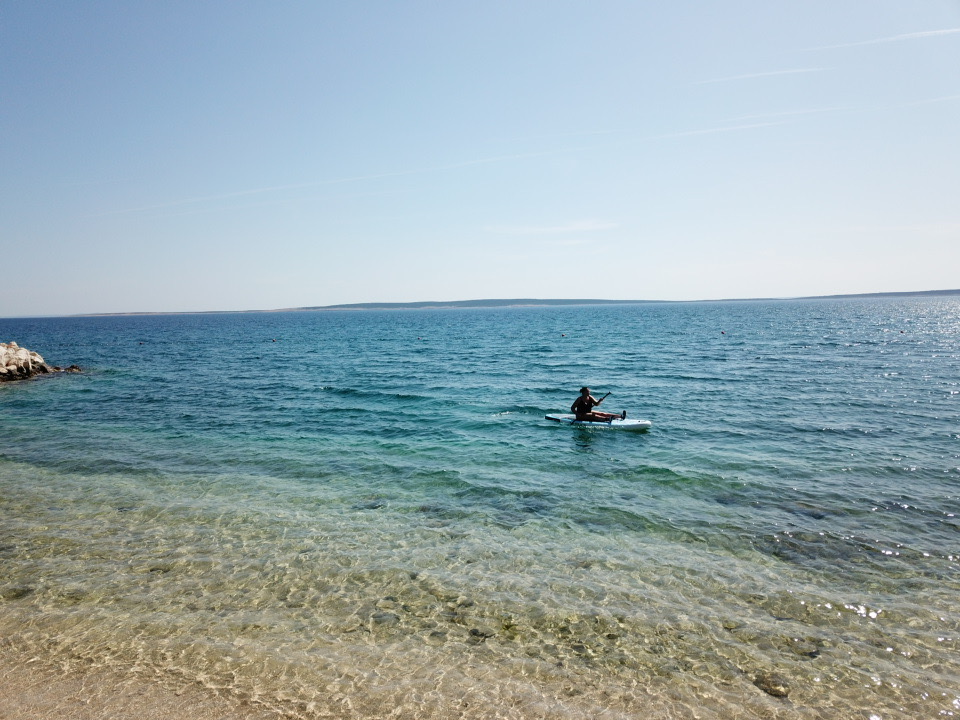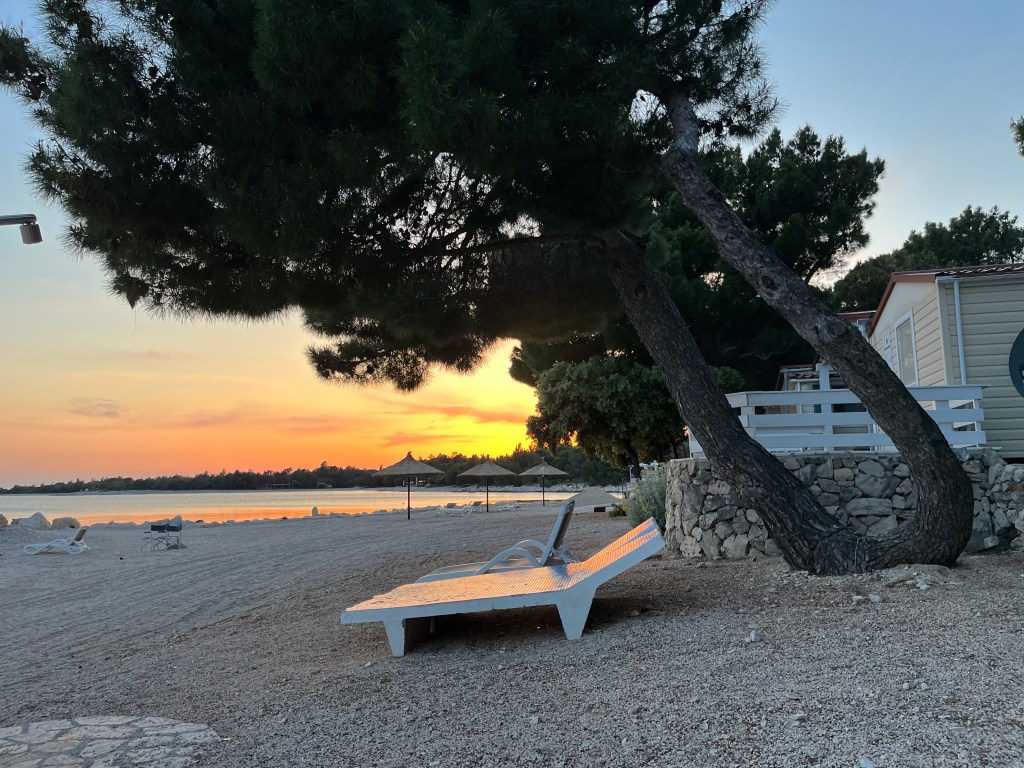 Auch wenn es vielleicht Langweilen sollte… wir haben wieder bei strahlendem Sonnenschein gefrühstückt. Dann stand ein junges Pärchen auf dem Stellplatz vor uns. Kurz danach wurde mit einem kleinen Trecker der Wohnwagen „angeliefert“ und dann holte der junge Typ sein Auto hinterher. Wir dachten uns, hey, wir haben neue Nachbarn und anhand des Autokennzeichens konnte man erkennen, dass es sich um Deutsche handelte. Mike und ich saßen vor unserem Womo und schauten sozusagen aus erster Reihe bei dem Schauspiel zu – nicht, dass die beiden mal gegrüßt hätten – immerhin haben sie uns reden hören und auch unser Kennzeichen verrät relativ eindeutig unsere Herkunft. Aber nein, es kam noch besser… die beiden haben nicht einmal miteinander geredet. Der Typ fing an, den Wohnwagen richtig hinzustellen, die Stützen auszufahren und das Vorzelt aufzubauen und seine Freundin / Frau zog sich um und ging wortlos an den Strand, um sich dort in die Sonne zu legen. Unsere Schlussfolgerung: die müssen sich ganz fürchterlich auf dem Weg nach Pag gestritten haben. Ich kann nur sagen, dass Mike mir wohl die „Haare föhnen“ würden, wenn wir irgendwo ankommen, ich ihn die ganze Arbeit allein machen lasse und mich stumpf und wortlos an den Strand in die Sonne lege. Nun ja, jeder ist da wohl anders.