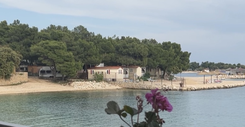 Nach dem Frühstück haben wir kurz abgewaschen, dann haben wir uns Turnschuhe angezogen, Badelatschen sind nicht unbedingt das beste Schuhwerk, um längere Strecken spazieren zu gehen. Wir wollten uns den Ort Simuni ansehen, also gingen wir los. Ich hab vergessen, dass der Platz, auf dem wir stehen, in Parzellen terrassenförmig angelegt ist – was bedeutet, dass man erstmal den einen oder anderen Meter in der Sonne bei ca. 25 Grad Celsius bergauf geht… da ich definitiv nicht fit bin, hab ich geschnauft wie eine Dampflok, Mike hat das besser gemeistert oder er hat einfach sehr viel leiser geatmet 😉 ok, irgendwann – gefühlt Stunden später – kamen wir oben an der Rezeption des Stellplatzes an und gingen von dort an der Straße in Richtung Ort, dann ging es wieder bergab und wir kamen in dem Dorf an. Die Restaurants fangen gerade erst an, die Tische und Stühle draußen aufzustellen und die Außedeko aufzuhängen. In dem kleinen Hafen lagen ein paar nette Boote. Ansonsten befand sich der Ort noch im Dornröschenschlaf. Also befragten wir unser App „Exit“, weil wir vom Stellplatz aus eine Beachbar gesehen hatten, die wir leider aufgrund des Zaunes des Campingplatzes nicht trockenen Fußes erreichen konnten. Seht selbst: