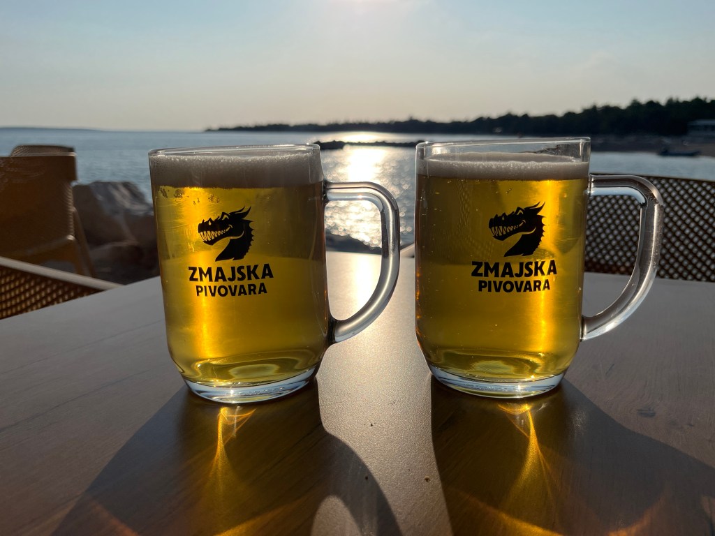 Zu Abend gegessen haben wir in der Harpoon Bar, der Beachbar, die am Strand ist. Es gab als Vorspeise (wieder total kroatisch ,-)) Frühlingsrollen und frittierte Garnelen, gefolgt von „Surf and Turf“-Sandwiches. Dazu gab es ein frisch gezapftes Bier.