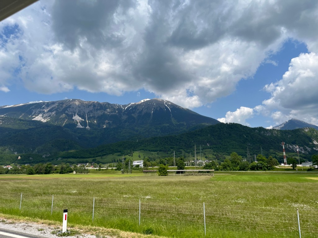 Mike und ich waren irgendwie schon vor dem Wecker wach, also raus aus der Koje, Mike kochte uns Kaffee und ich kontrollierte noch einmal alle Fenster, Luken und Staufächer. Dann hat Mike den Motor angeschmissen und wir fuhren zum Ausgang des Campingplatzes. Bezahlt hatten wir bereits am Abend davor, weil der Check-in oder Check-out erst ab 8 Uhr besetzt war. Wir waren somit gegen 6.30 Uhr auf dem Weg zur Fähre, die uns zum Festland bringen sollte. Gesagt, getan. Am Festland angekommen machten wir uns auf den Weg zur slowenischen Grenze. Da wir den größten Teil im Landesinneren auf der Autobahn zurück legten, kamen wir relativ zügig an der Grenze zu Slowenien an und überquerten diese. Mike fand an in einem Ort eine SB-Waschstation für LKW‘s und hat dort spontan unseren Hupi von Staub, Schmutz und toten Insekten befreit. Dann ging es weiter in Richtung Österreich. Wir hielten kurz vor der Autobahn in Slowenien, um die dortige Maut aufzuladen und dann ging es auch schon weiter in Richtung Karawankentunnel. Unser Ziel für heute war Laas und dort ein Bauernhof mit Gasthof. Dort angekommen begrüße uns ein anderer Womo-Fahrer mit den Worten:“ Ihr könnt Euch da hinstellen, der Bauer hat sich kurz hingelegt.“