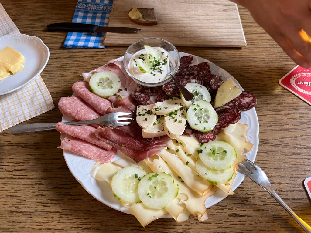 Doch der Liebe Wettergott spielte an diesem Nachmittag nicht so ganz mit, es zogen bedrohliche dunkle Wolken auf und es donnerte in der Ferne. Gewitter und ich (in der freien Natur) sind und werden keine Freunde mehr, also gingen Mike und ich lieber zum Gasthaus zurück. Dort angekommen, entschieden wir uns sehr schnell, dass wir was essen möchten, betraten das Gasthaus gegen 16.30 Uhr und bestellten eine Jause für zwei Personen und zwei Bier vom Fass.