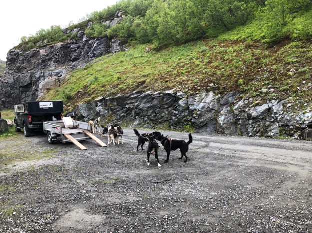 Der nette Norweger war mit einem Freund da, der auch seine Hunde trainieren wollte. Also wurden die Hunde nach Rangordnung aus dem Hänger geholt und vor das Quad gespannt… kein Schnee, kein Schlitten 😉.